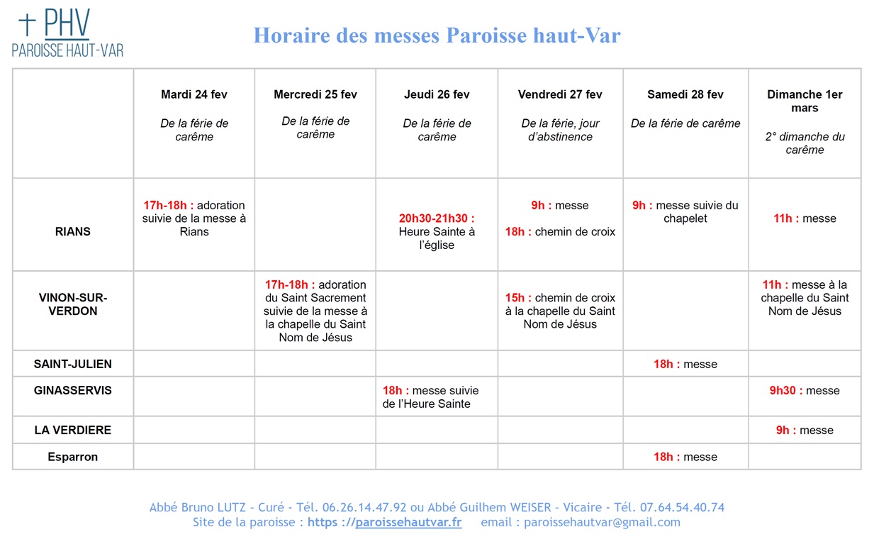 Horaires des messes du 24 février au 1er Mars