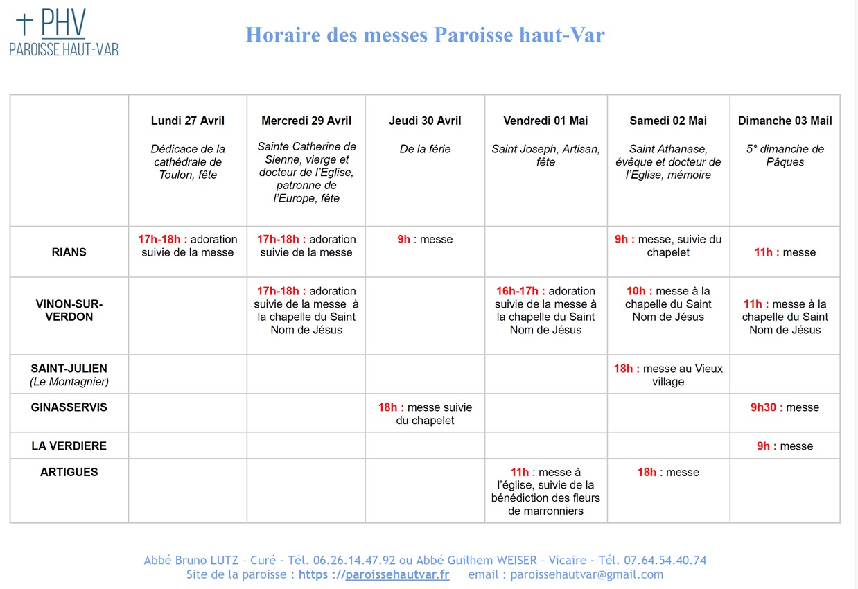 Horaires des messes du 27 Avril au 03 Mai 2026